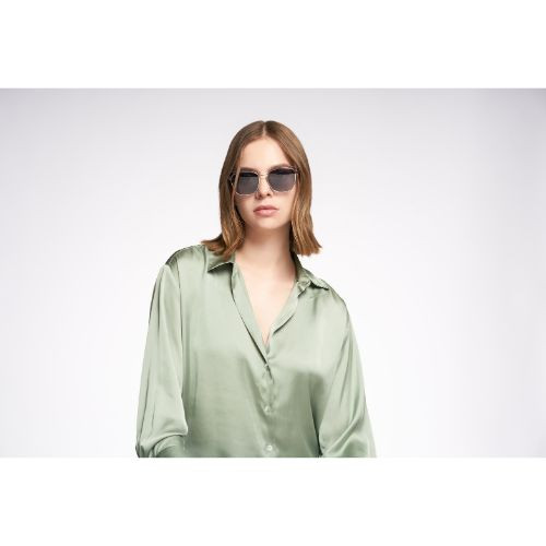 تميزي بإظهار إطلالة مميزة ورائعة باستخدامك نظارات شمسية مميزة من ماركة ليا بإطار معدني هندسي ذهبي أسود لامع، لون العدسة رمادي مستقطب ومستقطب لتقليل كمية الضوء وحماية عينيك بنسبة 100% من الأشعة فوق البنفسجية.